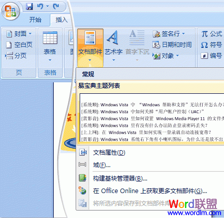5、在需要插入保存好的部件时,插入选项卡 -> 文档部件,发现你保存的文档部件在菜单上了,点一下就插入到文档了。