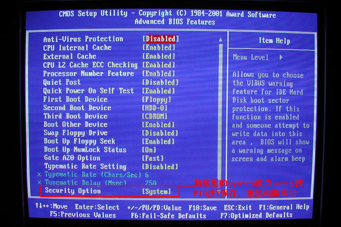 第一项BIOS基本常用设置就讲到这里了 Advanced BIOS Features(高级BIOS功能设置) 第二项。 下面讲一下第二项最常用的设置。 1.关闭BIOS防毒保护。 Anti-Virus Protection 请看图片5