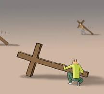 第一幅漫画中,每个人都背负着一个沉重的十字架,在缓慢而艰难地前行!
