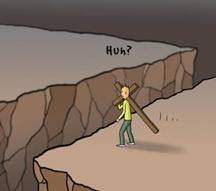 啊哈!谁料,前边忽然出现了一个又深又宽的沟壑!沟上没有桥,周围也没有路。也没有蜘蛛侠或者超人出来解救他…
