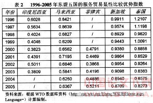 随着东盟五国服务贸易的发展,各国服务贸易的国际竞争力出现了一系列变化。我们采用净出口、显性比较优势和贸易专门化指数,对1996-2005年东盟五国的服务贸易竞争力进行实证分析。