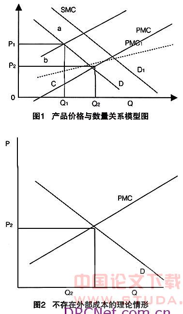 图1横轴表示生产与消费时会产生污染的产品数量,纵轴代表产品的价格,PMC线(即私人边际成本线)为厂商的供给曲线。自由市场的均衡产出量和价格分别是Q2、P2。如果考虑环境成本,曲线PMC并不代表产品的实际社会成本。假设单位产品在生产和消费时必须承担2美元的环境成本则单位产品产出时就应当缴纳2美元的销售税或费用,从而得到实际社会边际成本SMC。如图1ac即为2美元的环境成本。需求曲线D和社会边际成本曲线SMC的新交点Q1是有效产量,P1则是相应的价格。因此,考虑环境成本后污染产品的实际产出量将由Q2降低到社会最优产量Q1,对消费者收取的价格从P2上升到P1。根据需求曲线和供给曲线的相对弹性,额外支付的2美元应由生产者和消费者共同分担。如果政府明确界定环境资源的产权,则受污染损害的第三方有权索取2美元的赔偿。综上所述,通过环境成本内在化的措施可以减少污染的产品数量,使之达到社会最优水平。